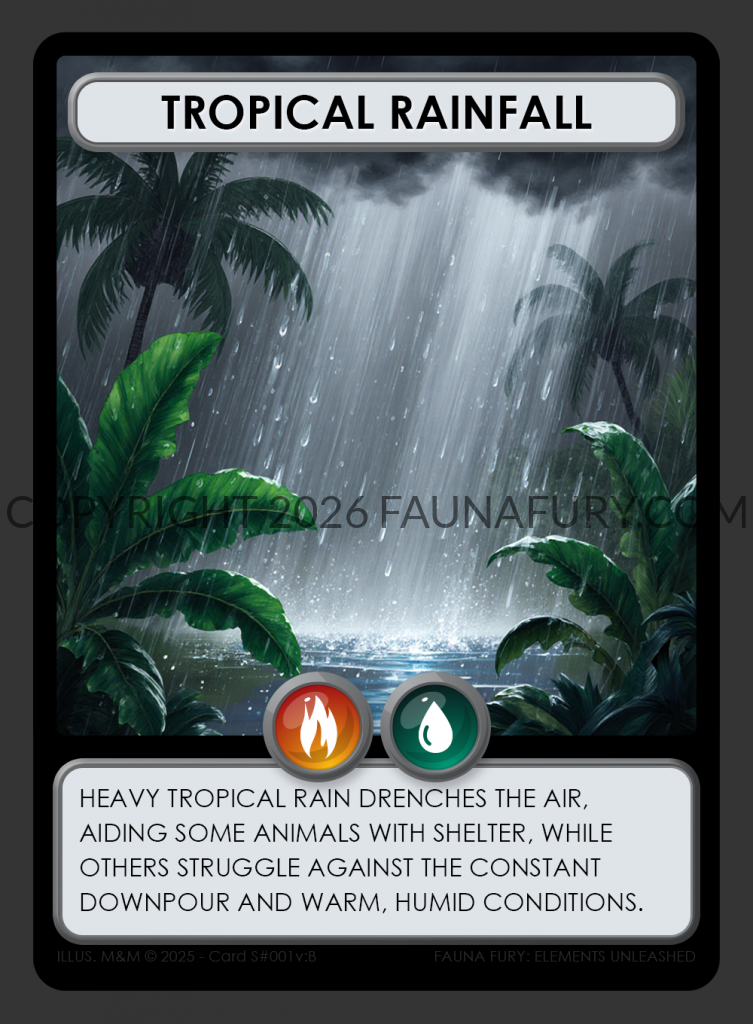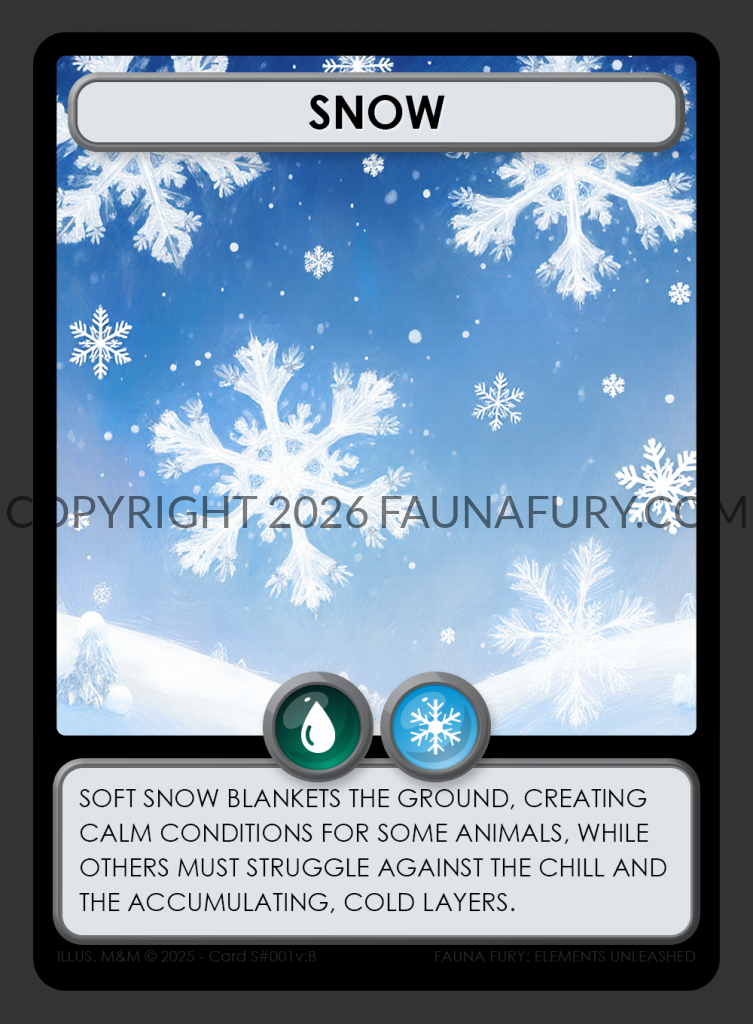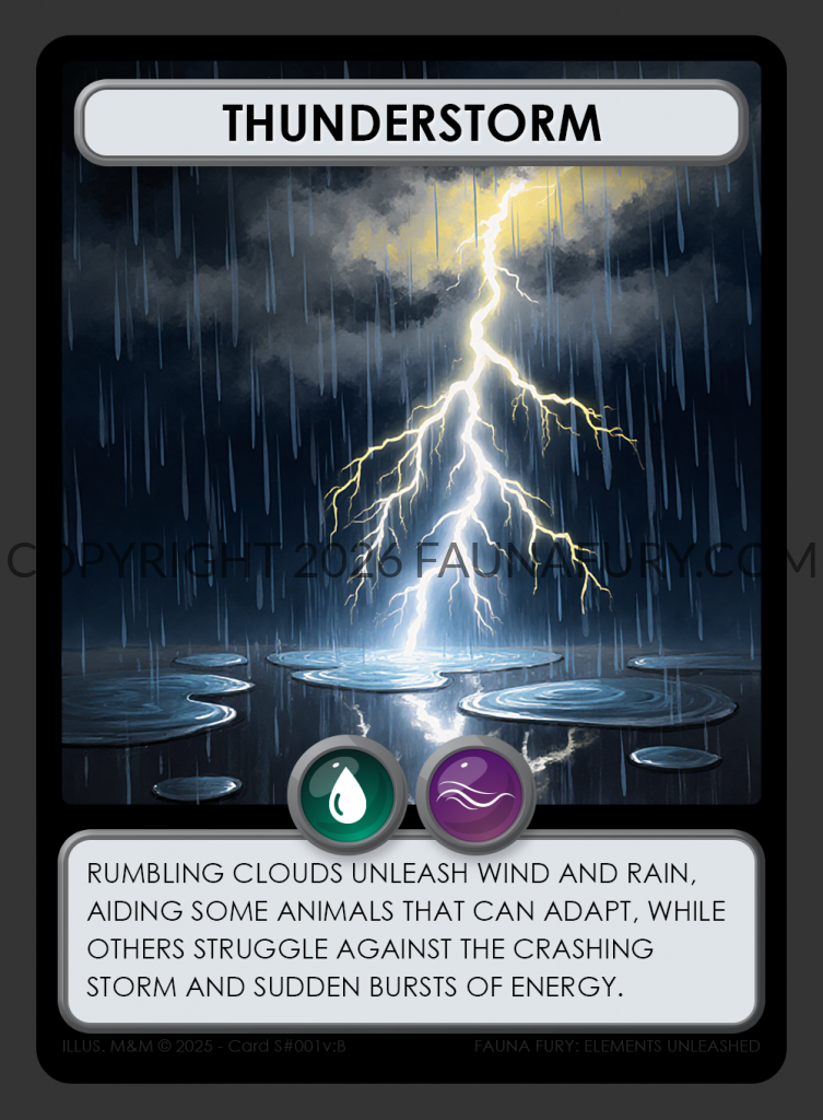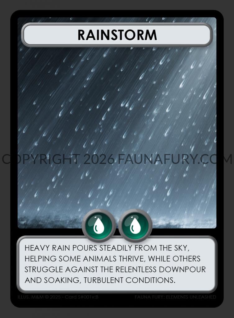Nature cards represent the raw forces of the wilderness, shaping the fate of creatures in the game. While some, like rain, embody singular elements such as water, others wield a fusion of forces. For instance, a thunderstorm blends the power of water and wind, while snow blankets the landscape with the combined might of water and cold. Each card holds the potential to alter the game’s dynamics, offering both peril and promise to players navigating the wilds.